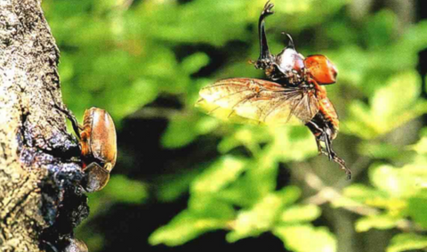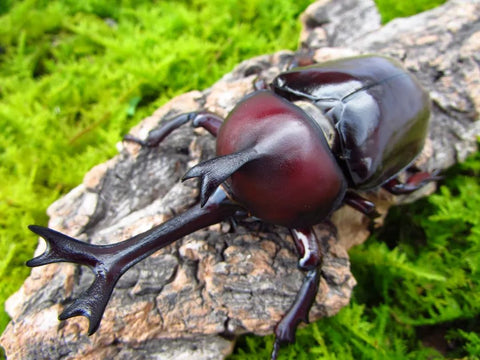 The development of Allomyrina dichotoma goes through four stages: fertilized egg, larva, pupa and adult. The two-pronged rhinoceros golden turtle sleeps in the daytime and rises at night. It starts to move at dusk and has phototaxis. The male is more aggressive. When fighting, he will first shake his forehead up and down, contract his abdomen and make a "squeak" sound to demonstrate. The larvae mostly feed on humus formed by rotten wood; Adults feed on the tender branches of plants such as elms, mulberry and figs and the flowers of melons. The feeding method is highly specialized. First, the bark is cut with a shovel like upper lip, and then the sap is licked with a brush like tongue. It is distributed in China, the Korean Peninsula, Japan, Malaysia and Laos.