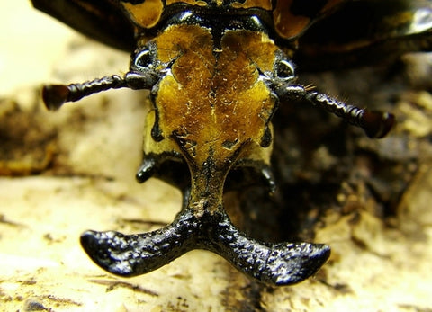 The male is almost always larger than the female, and has obvious "horns" on its head, which is used to fight with other males to seize the right to feed and mate; Female insects have no "horns" and their heads are wedge-shaped.