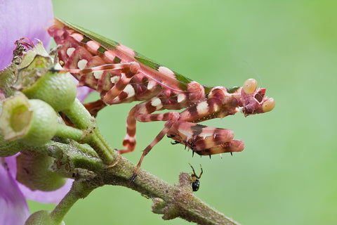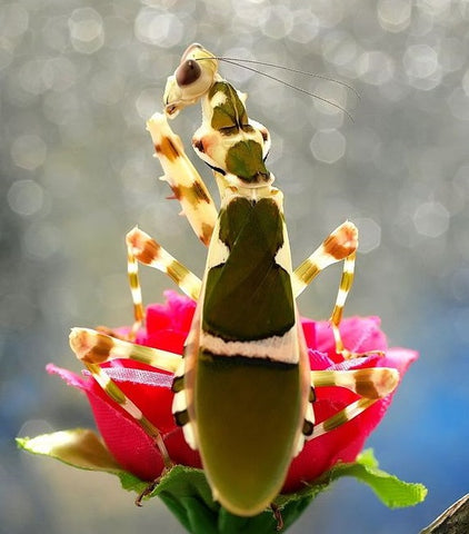 Mantis is one of the top predators in the insect world, and has its own secret of success. First of all, they are one of the species with the most developed compound eyes among insects. Good eyesight means better perception. Secondly, the mantis has the most efficient capture foot in the insect world, that is, the pair of sickle-like feet with the front chest, and the "blade" of the "sickle" is densely covered with a row of spikes, making the prey "locked" and unable to escape. Finally, most of the mantis are green and grass yellow, and some of the mantis' simulated petals are pink or light yellow. These colors can make them well integrate into the local environment to kill enemies secretly.